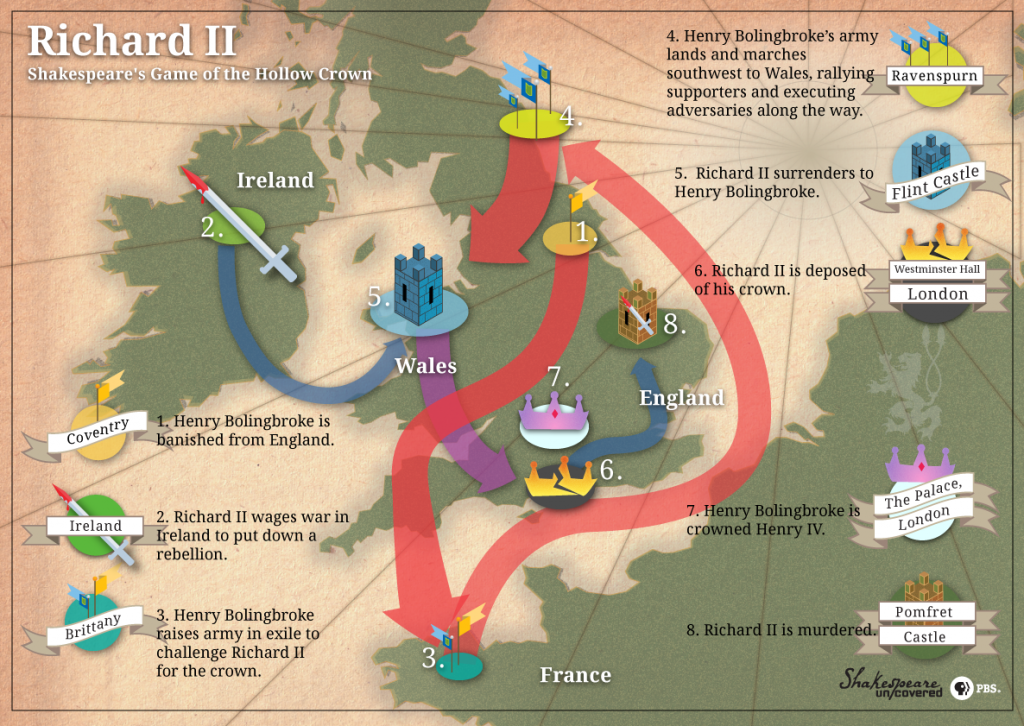 Using Shakespeare's Richard II, Henry IV, Part 1 and Henry IV, Part 2 as your map, follow the history of rebellion in 15th century England and the successive stories of three kings: Richard II, Henry IV and Henry V. Teachers can print these infographics and hang them up in the classroom to enhance learning.