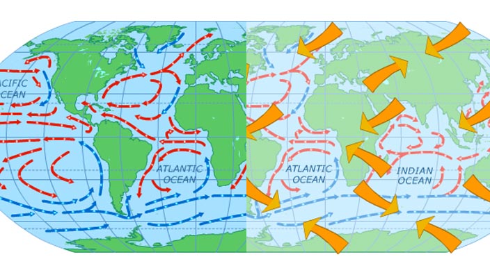 When most people think about the movement of ocean water, they think of waves or tides. Less visible are ocean surface currents that can move water as much as 100 kilometers (62 miles) per day and distribute everything they contain to distant oceans and seas. This visualization from McDougal Littell/TERC illustrates the patterns of ocean currents and the global wind patterns that drive them.