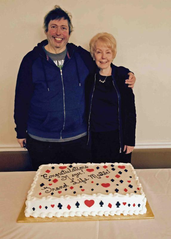 It's a rare feat to become a Grand Life Master, requiring both a National win and 10,000 masterpoints. Philadelphia Regional chair, former Unit 141 Tournament Chair, and all-around great guy Meyer Kotkin has achieved that milestone. His National win came in the 2011 Wernher Pairs with his friend Howie Cohen. Meyer earned the 10,000th masterpoint at the Claymont Regional in March. Unit 141 celebrated the success at its Sectional at Bala in April with hearty congratulations and a giant cake. Thanks to District 4 Director Joann Glasson, who made a special trip in the snow to bring the cake and make the celebration possible.