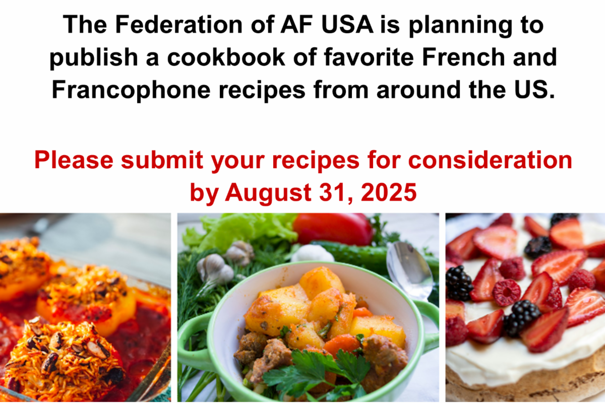 The Federation of AF USA is planning to publish a cookbook of favorite French or Francophone recipes from around the Alliance Française USA network.