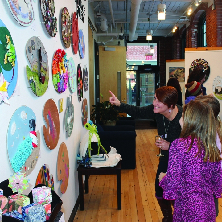 Artists of all ages and abilities transformed ordinary wooden art palettes into unique works of art. They are displayed together on the gallery walls for all to enjoy.