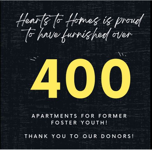 Every month, we watch the impact that Hearts to Homes makes expand and multiply! The simple story is that your donations have helped us furnish over 400 apartments for youth embarking on their independent lives after aging out of foster care. The more nuanced story is that we have expanded in ways that ensure that more young adults will qualify and that those in other geographic areas can also be referred. Of the 400 young adults assisted, 110 of them aged out as parents, and your gifts helped create safe and comfortable homes for 136 infants, toddlers and young children. Our gratitude for your support of our mission is heartfelt!