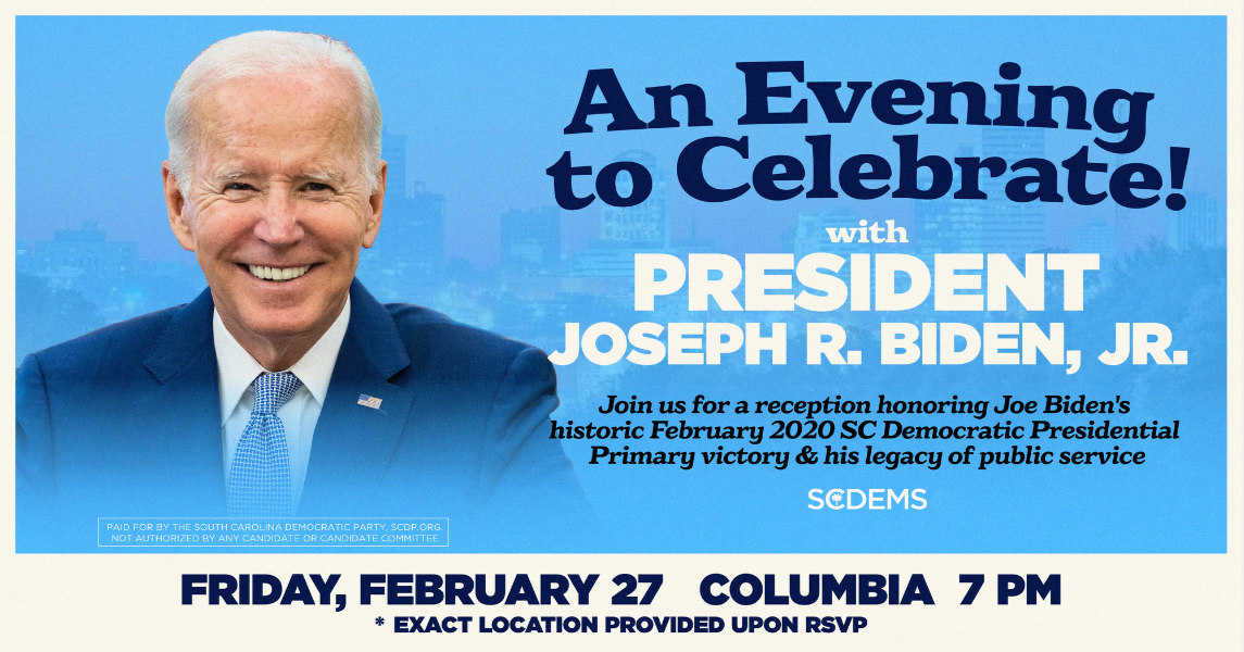 We are honored to have President Biden join us in Columbia on Friday, February 27, to commemorate his pivotal primary victory and to thank him for a lifetime of public service, and we would love for you to join us.