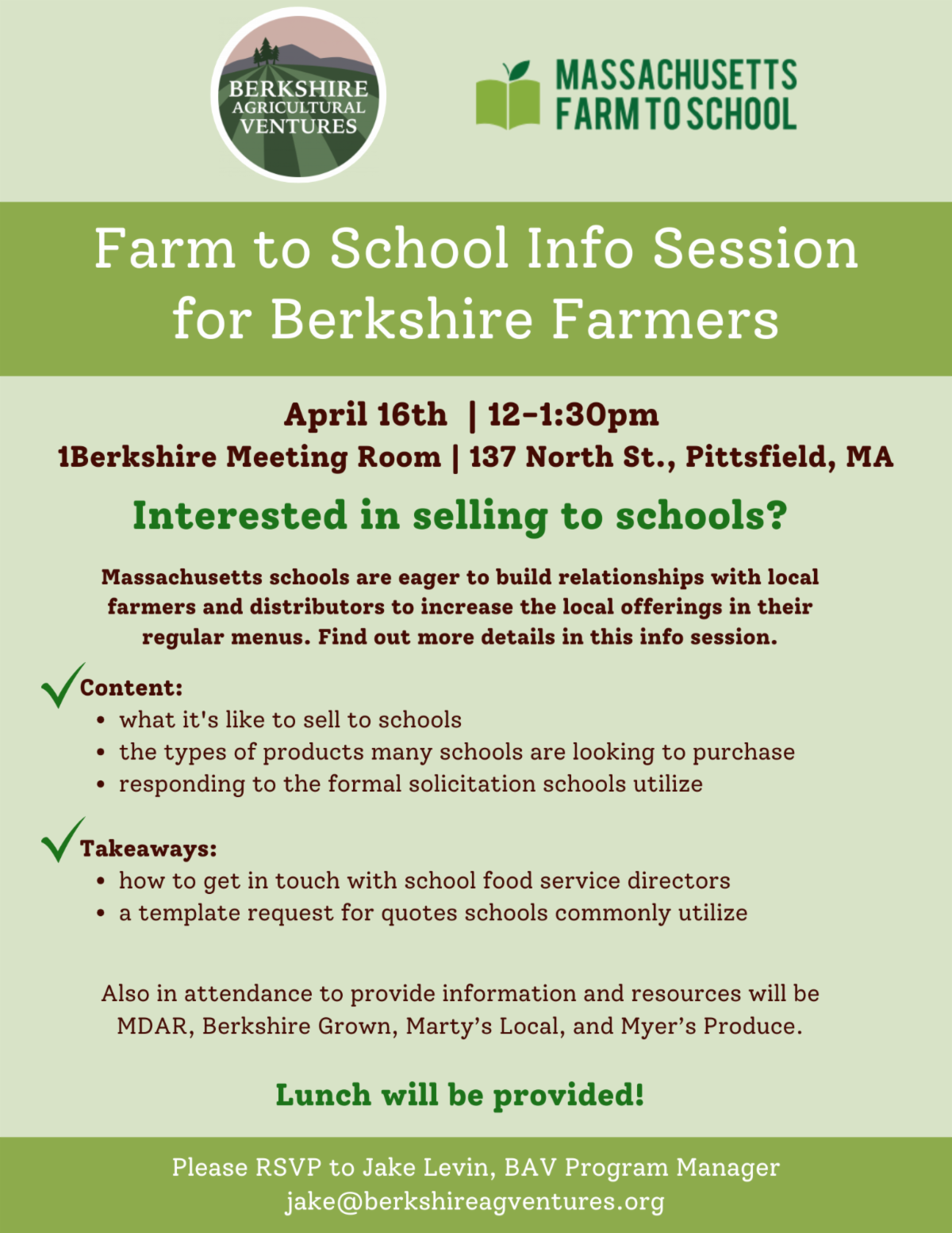 Berkshire County Farmers: Join BAV and partners on April 16 in Pittsfield, MA, to learn more about farm to school opportunities. See details below. | |