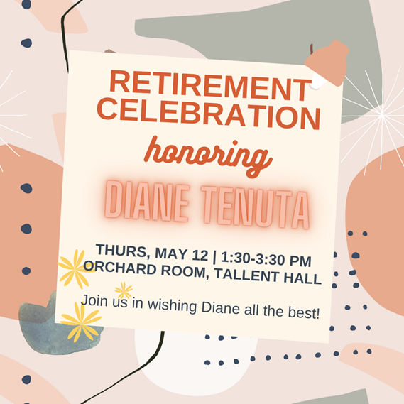Join us Thursday, May 12 from 1:30-3:30 PM, in the Orchid Room of Tallent Hall, to celebrate Diane Tenuta's retirement!
