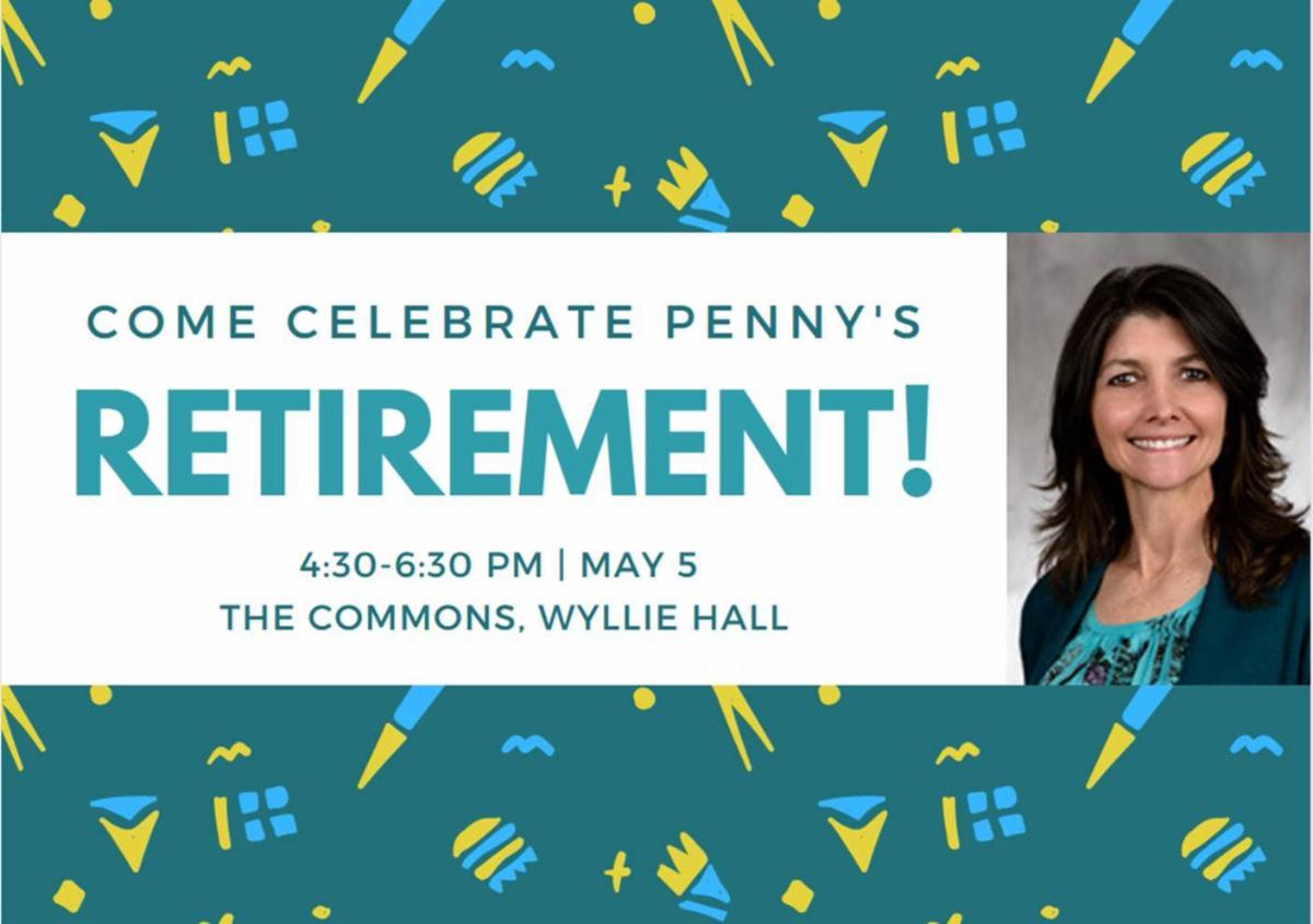 Join us Thursday, May 5 from 4:30-6:30 PM, in the Commons of Wyllie Hall, to celebrate Penny Lyter's retirement.