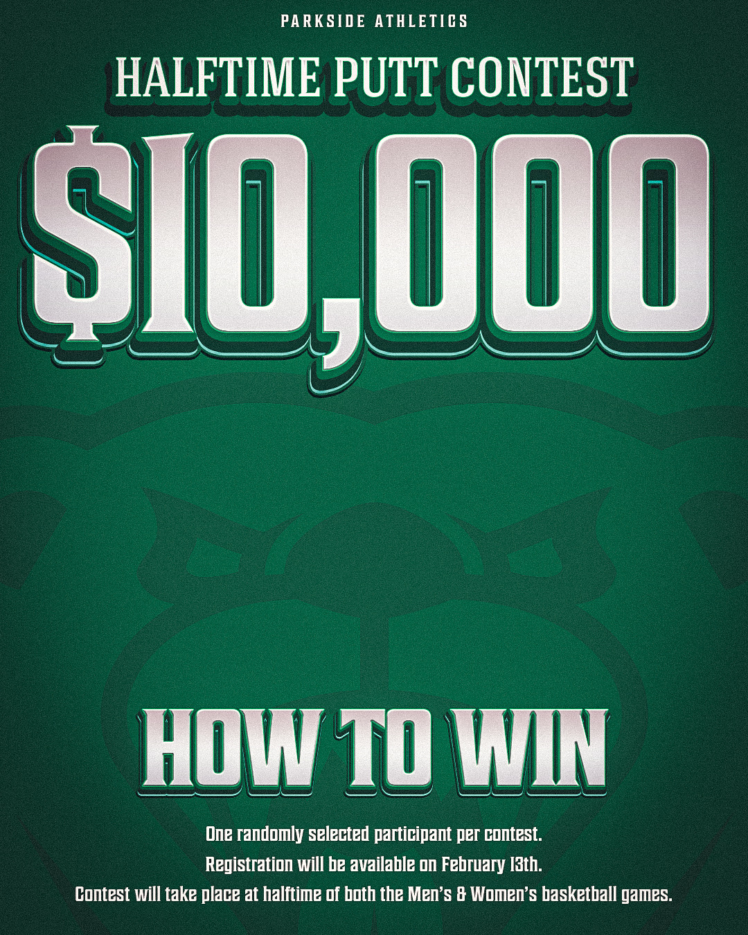 On Saturday, Feb. 15, Athletics will host The Omair Ahmed Tuition Giveaway, Open to all current UW-Parkside students. There will be one randomly selected participant at the men’s and one person at the women’s game to win up to $2,500 in tuition. The game is a series of basketball shots in a minute, a layup, free throw, 3pt shot and a half-court shot. If a student makes all of the shots, they win $2,500.