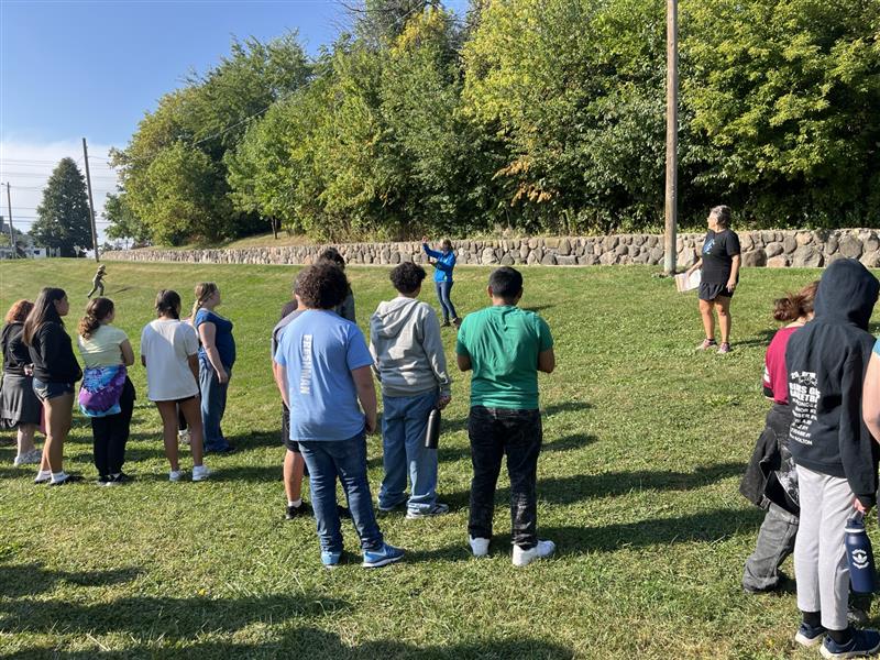 | | Photo by Cathy Mossman: Dr. Cathy Mossman, Distinguished Lecturer in the Biology department spent some time assisting Harborside Academy students with fieldwork. They were documenting the number of native plant species that were planted by Root-Pike Watershed Initiative Network as part of a restoration project. | | |