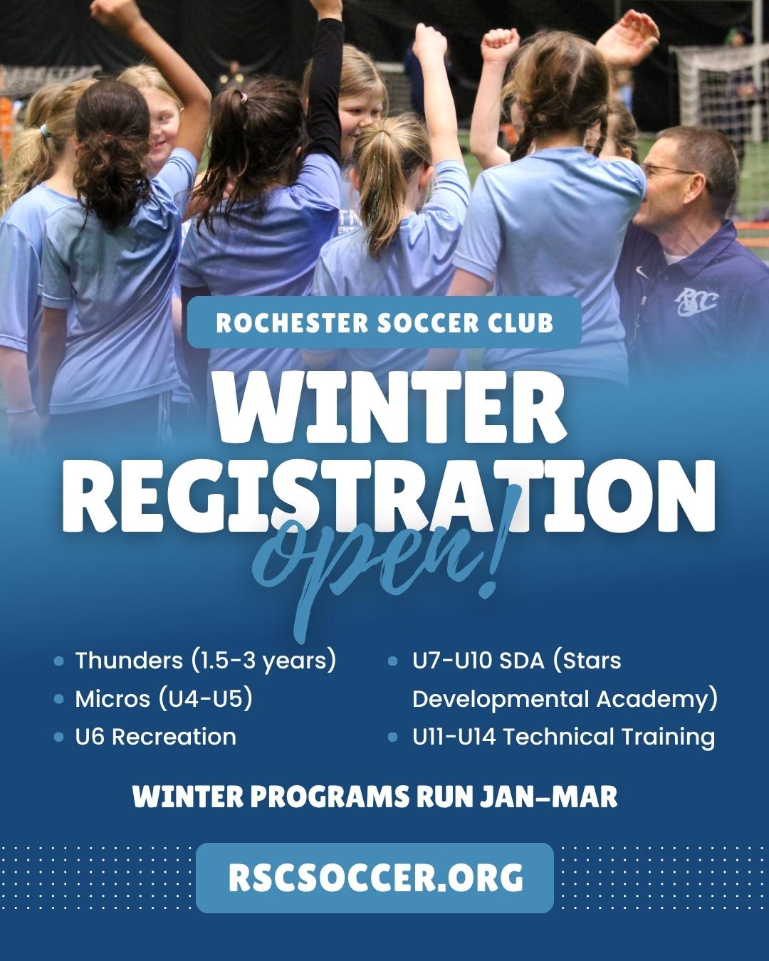 Winter program registration is officially open! Our indoor programs run from January through March, offering players the opportunity to stay active and improve their soccer skills in a safe, fun, and welcoming environment!