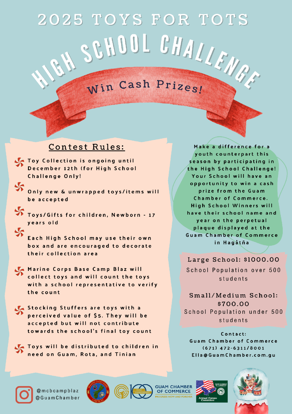 The recent government shutdown has delayed the program; however, we are confident that we can still make a difference for children in need this year. Toy collection for the High School Challenge will take place until December 11, 2025, and pick-up will occur on Monday, December 15th, and Tuesday, December 16th.