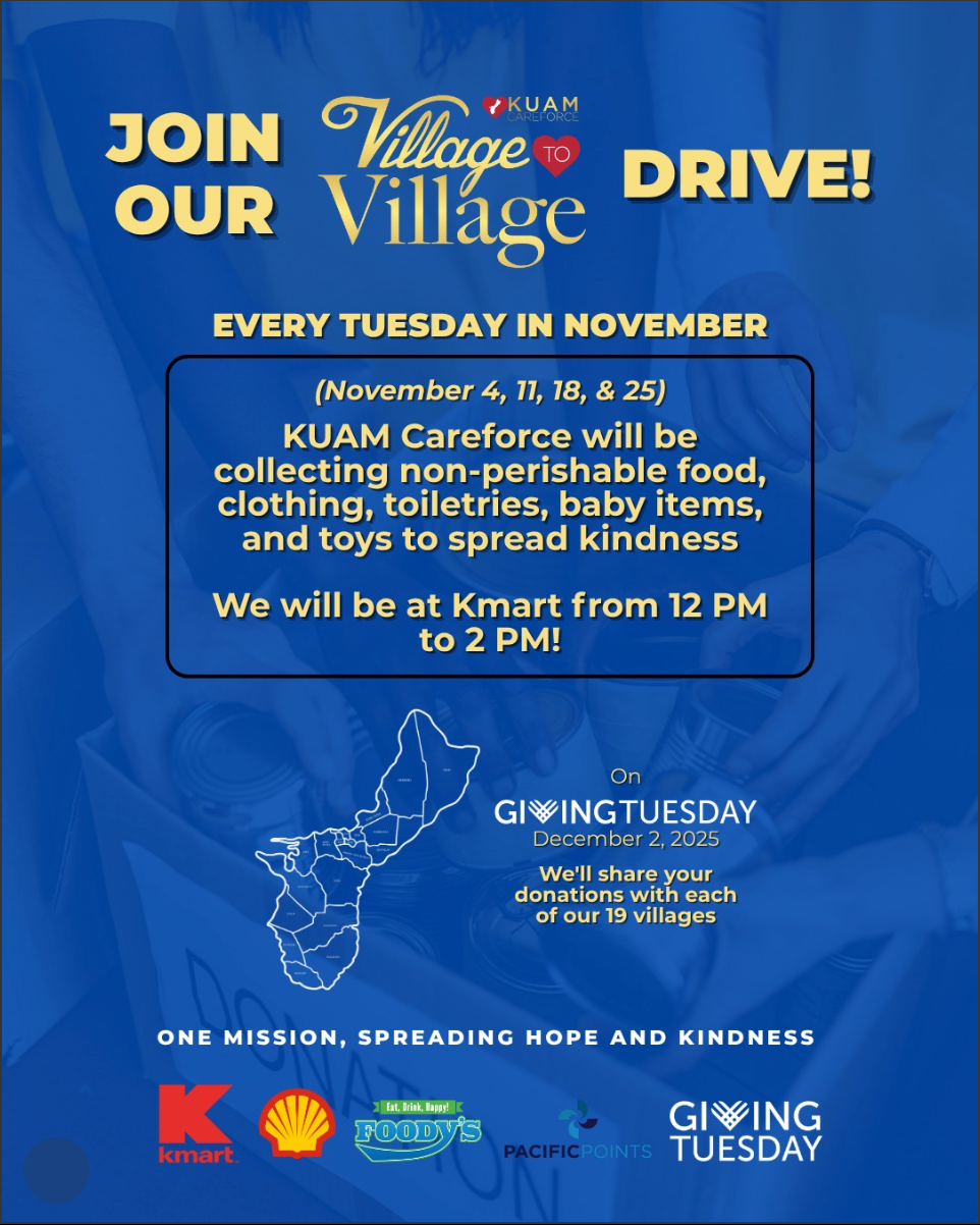 Every Tuesday in November, KUAM will be at Kmart from Noon to 2 pm, collecting non-perishable food, clothing, toiletries, baby items, and toys to spread kindness and support to families in need via our village mayors, the backbone of our community.