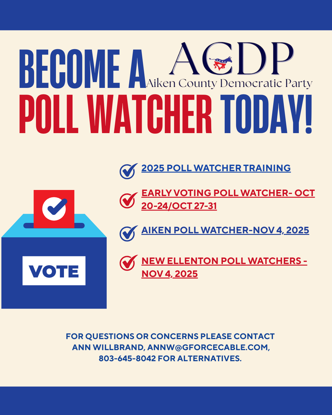 | If you sign-up as a New Ellenton Poll Watcher, you will have a 4-hour shift at the New Ellenton Community Center, 212 Pine Hill Ave., New Ellenton on Nov. 4, 2025. | If you select City of Aiken, you and a partner will be assigned as a RovingPoll Watcher on a route of 4 – 5 nearby polling places for Election Day, Nov. 4. You will visit each location to check on how voting is going and to report back to ACDP on turnout. You will then move on to the next polling place. You should visit each polling place 2 or 3 times during your half day shift. | If you cannot attend any of these training options, please contact Ann Willbrand, annw@gforcecable.com, 803-645-8042 for alternatives. | |