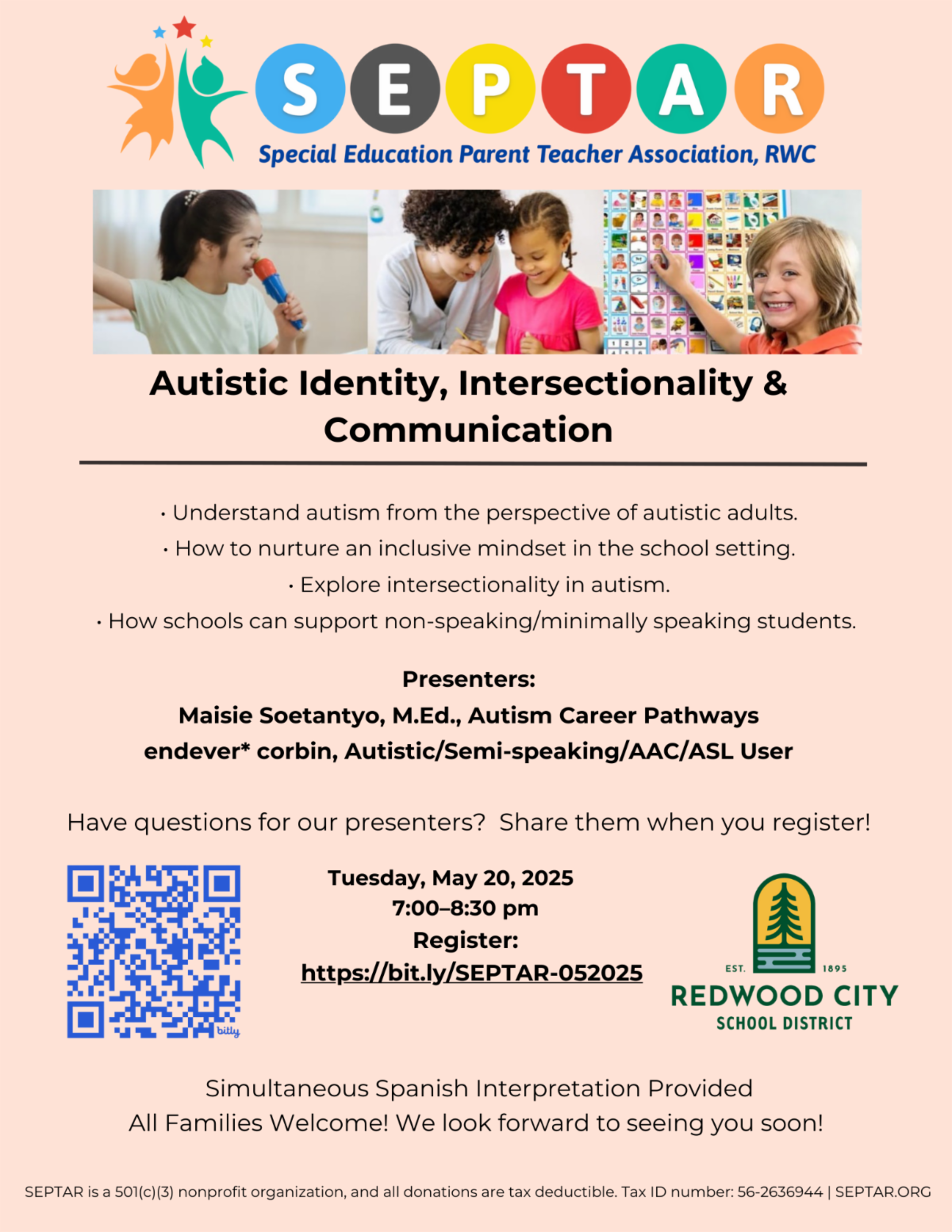 SEPTAR (Special Education PTA Redwood City) and Redwood City School District invite you to a special presentation on understanding autism. All families welcome! FREE admission.