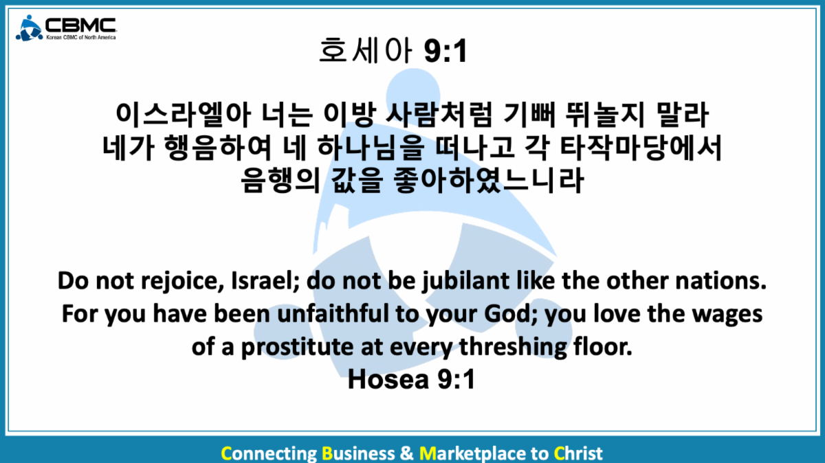 이스라엘아 너는 이방 사람처럼 기뻐 뛰놀지 말라 네가 행음하여 네 하나님을 떠나고 각 타작마당에서 음행의 값을 좋아하였느니라