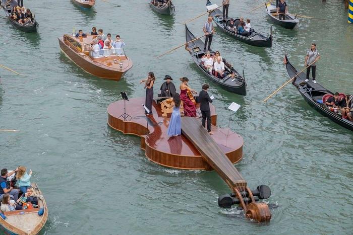 To honor Italy's rebirth following Covid-19, Venetian artist Livio De Marchi created a 39-foot-long vessel shaped like a violin. The string quartet on board played Vivaldi's Four Seasons. Divertitevi!