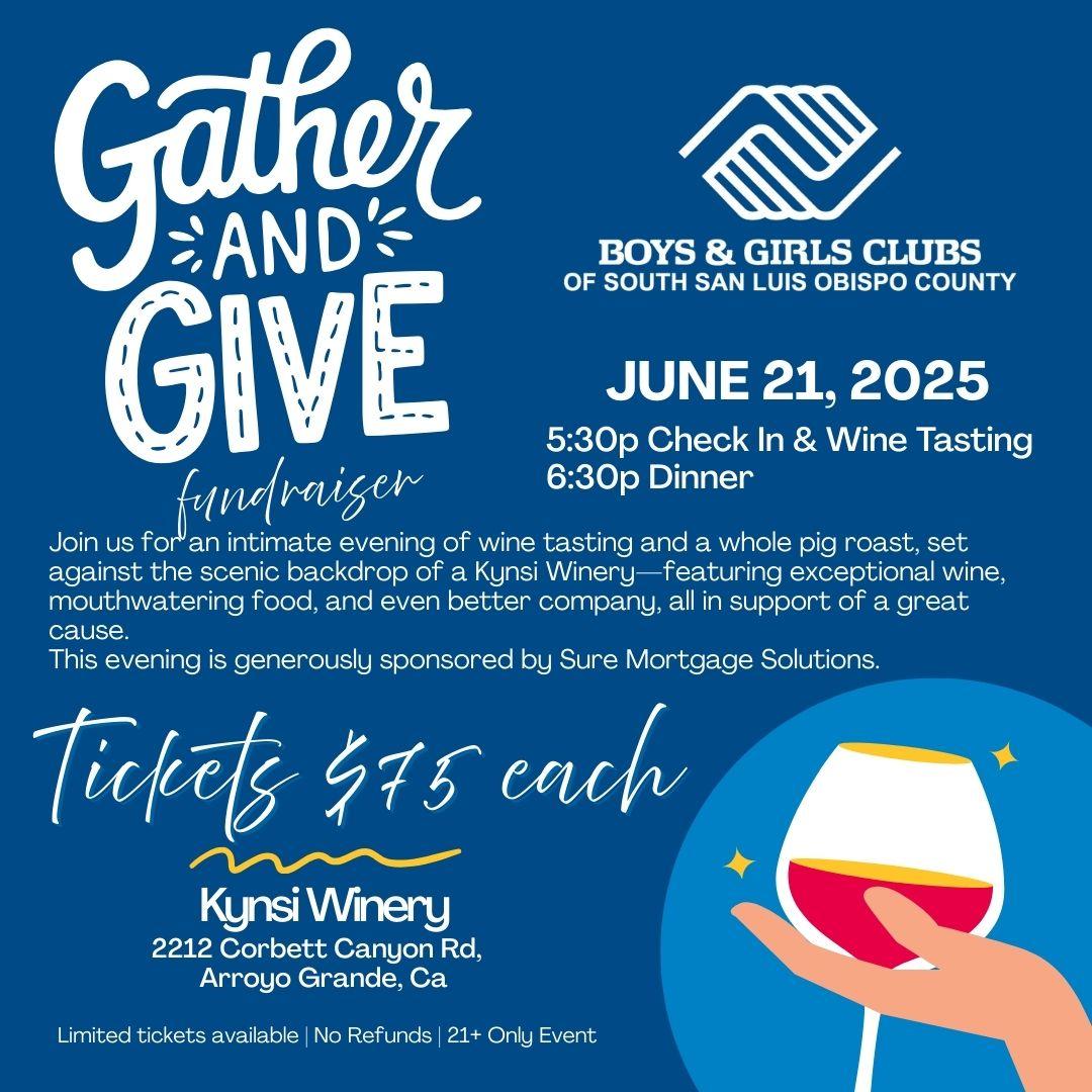 Join us for Gather & Give Fundraiser, an intimate and unforgettable evening of wine tasting and a whole pig roast, set against the stunning scenery of Kynsi Winery. Savor exceptional wines, indulge in mouthwatering food, and enjoy heartfelt company—all in support of the Boys & Girls Clubs of South San Luis Obispo County.