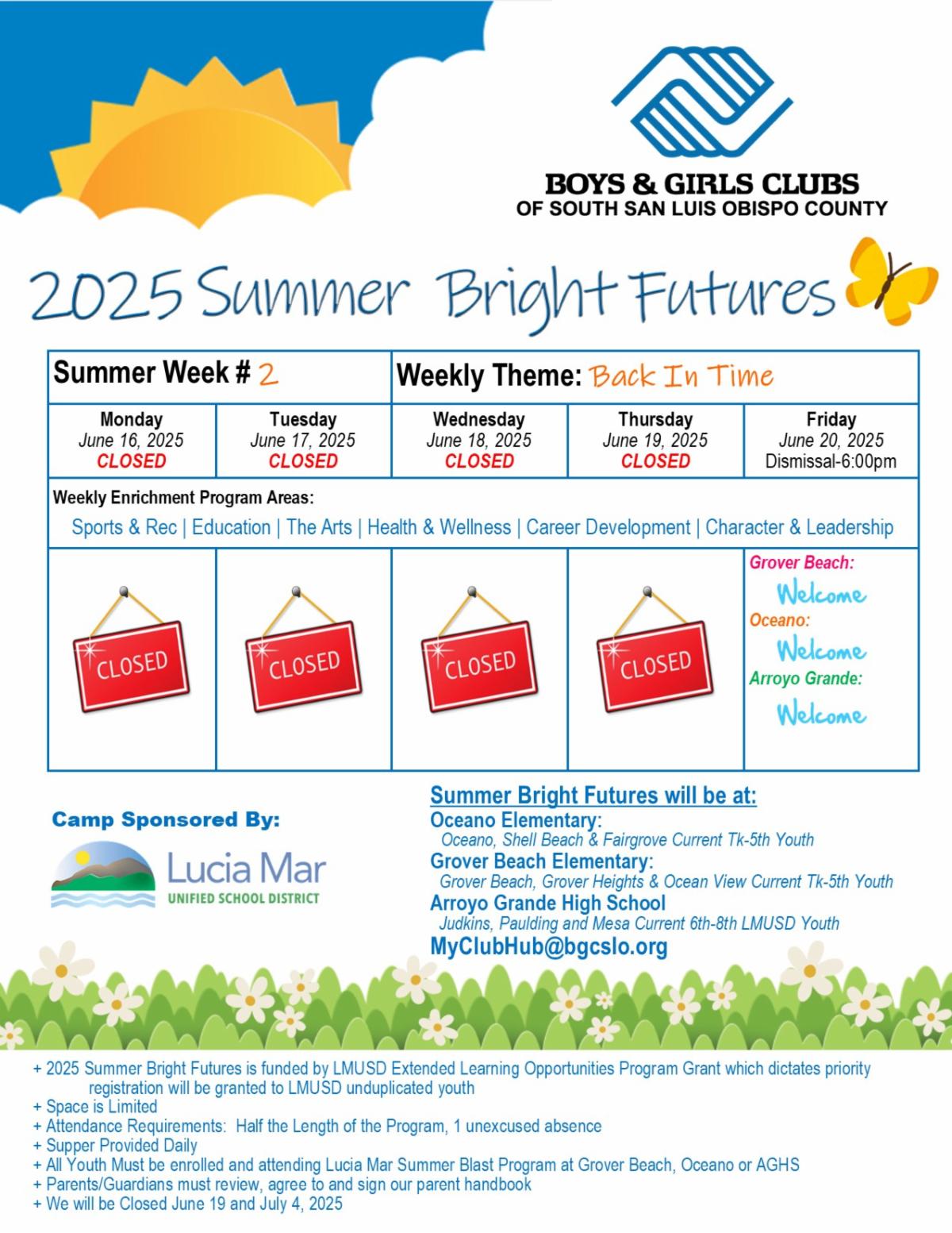 - Space is Limited – Priority registration is given to Lucia Mar Unified School District (LMUSD) unduplicated youth per funding guidelines.