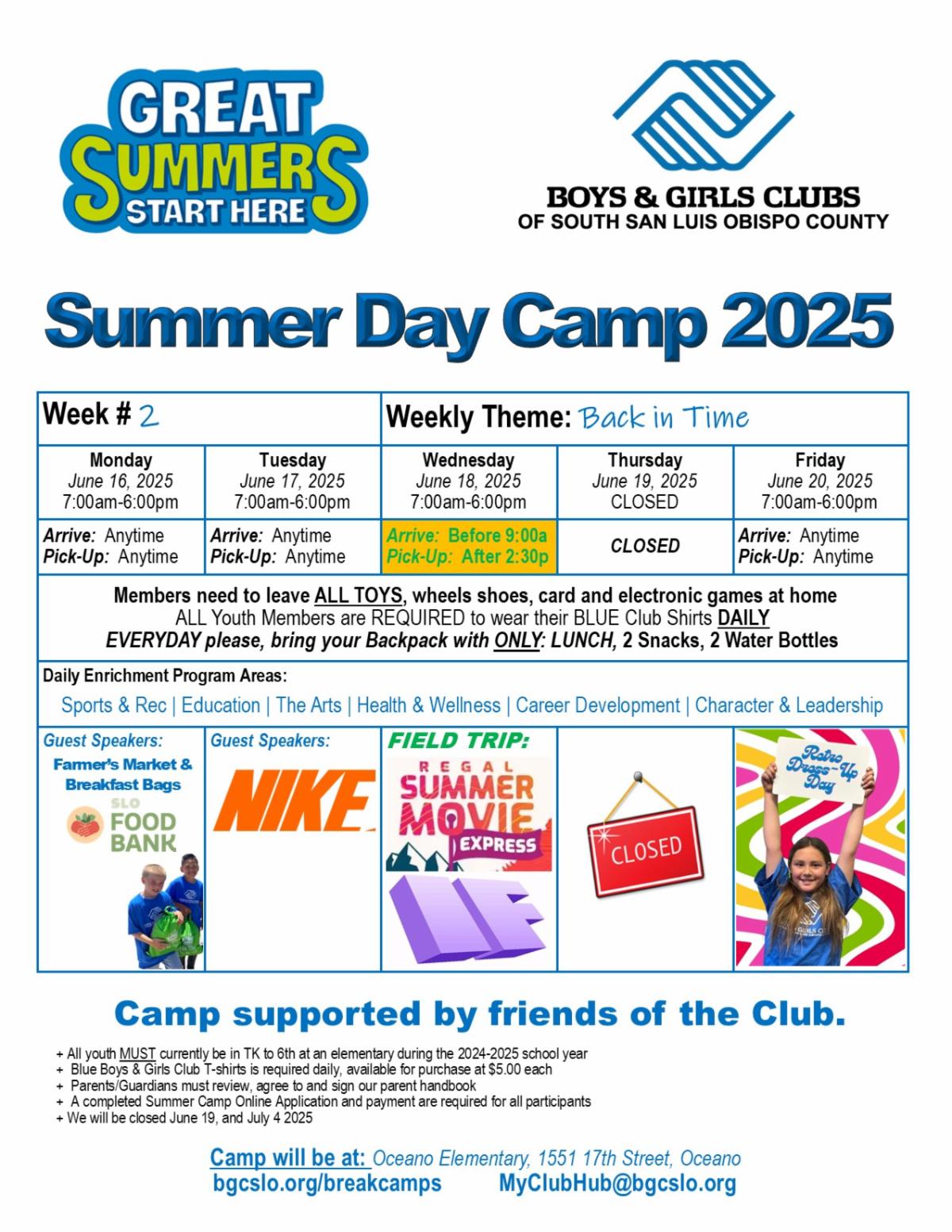 A blue Boys & Girls Club T-shirt is required daily ($5 each, available for purchase).