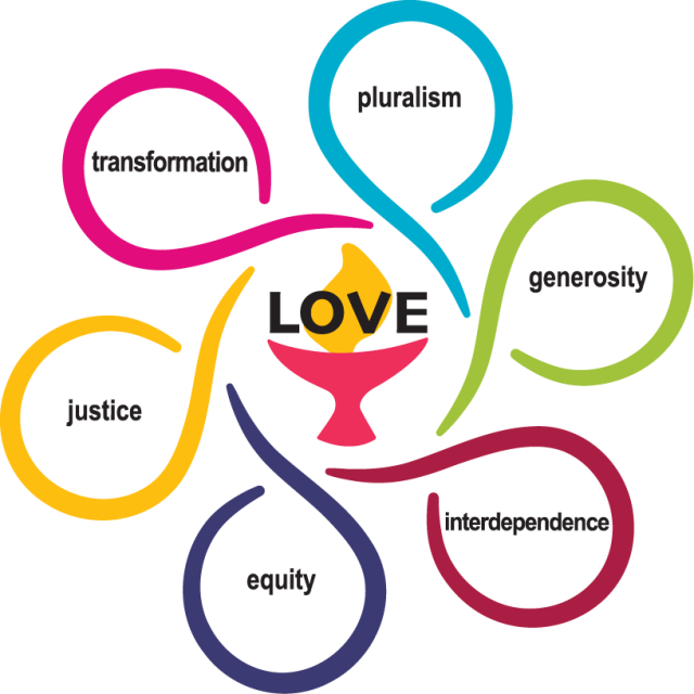 As Unitarian Universalists, we covenant, congregation-to-congregation and through our Association, to support and assist one another in our ministries. We draw from our heritages of freedom, reason, hope, and courage, building on the foundation of love. Love is the power that holds us together and is at the center of our shared values. We are accountable to one another for doing the work of living our shared values through the spiritual discipline of Love. Inseparable from one another, these shared values are: Interdependence, Equity, Transformation, Pluralism, Generosity, and Justice.