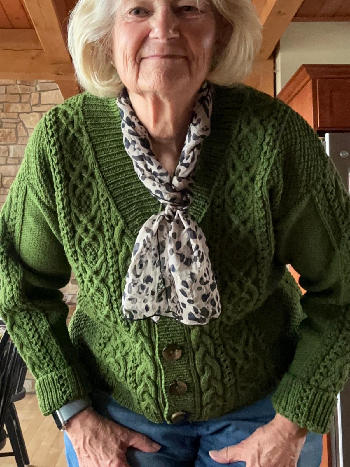 MB used Brown Sheep Stratosphere in Color S24R "Tree Line." When she ordered the yarn and let me know what she was knitting, I figured it was a great color for her to wear. Well, the cardigan is at my house and I'm loving the color and the texture and the pure joy of a hand knit sweater.