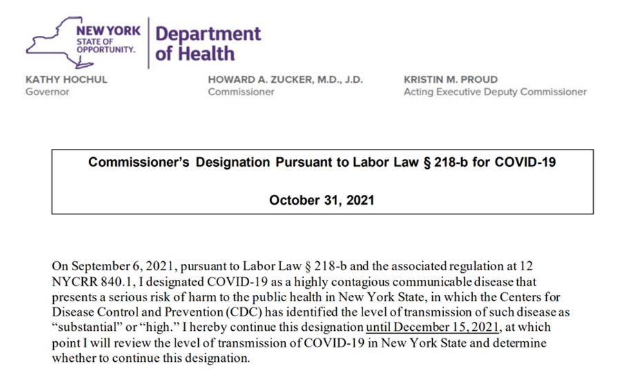 Gov. Kathy Hochul, in conjunction with the commissioner of the NYS Department of Health, has decided to extend HERO Act protocols until December 15, 2021.