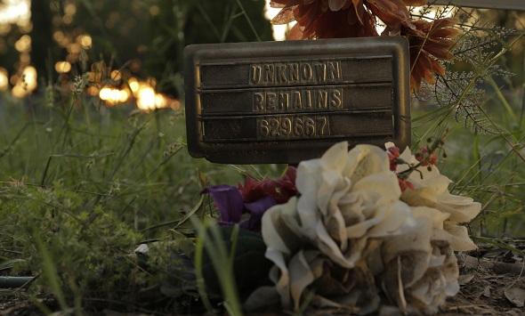 Image description: In this still from Jeff Bemiss and Lisa Molomot's film MISSING IN BROOKS COUNTY, a small metal grave marker reading "Unknown Remains 629667" emerges from behind some white, orange, and purple flowers, surrounded by tall grass, and bathed in a soft warm light.