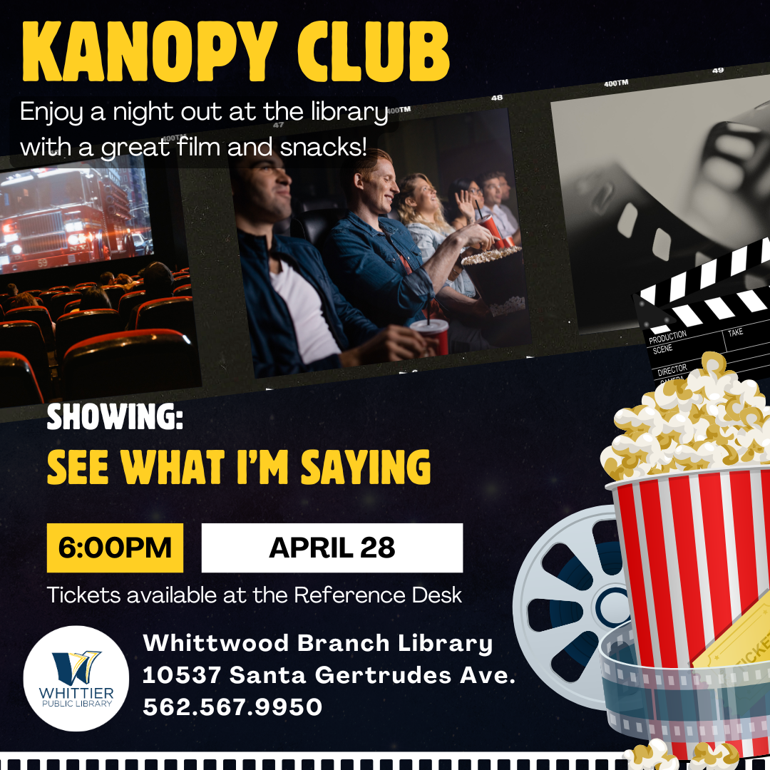 Love watching movies for free? Join Kanopy Club at the Whittwood Branch Library for a fun film night! This monthâs featured movie is See What I'm Saying (PG-13), showing on Monday, April 28th, at 6:00 p.m.