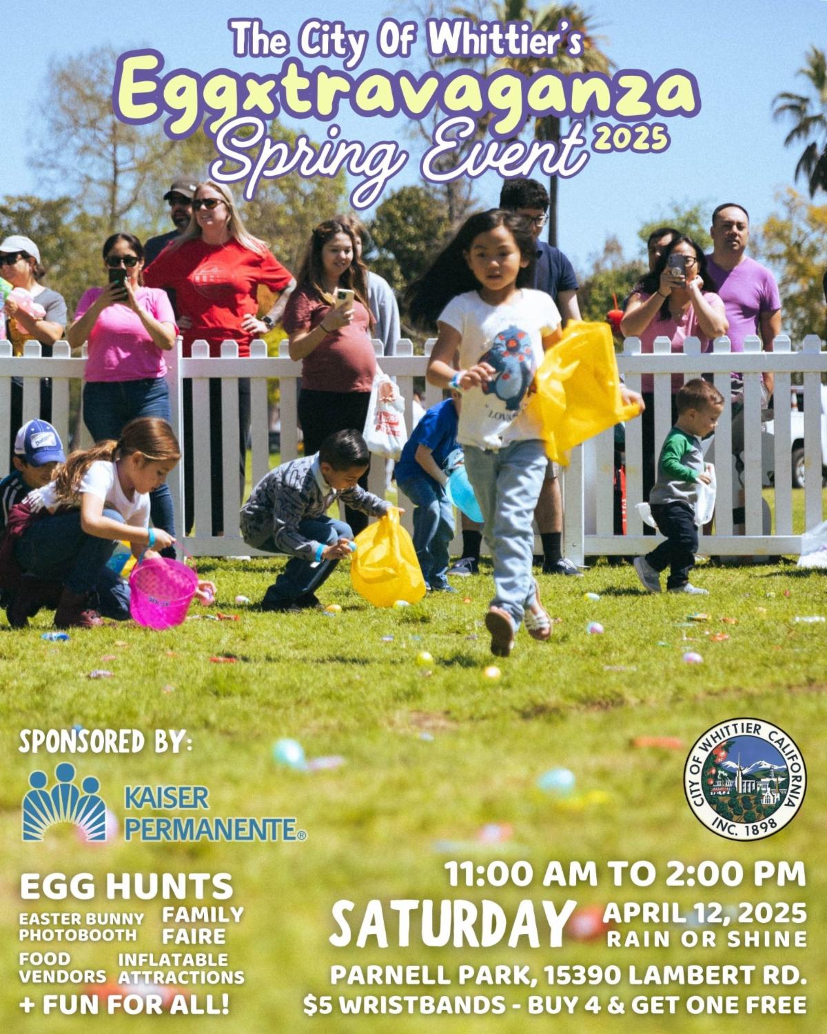 Spring is in the air, and Whittierâs favorite spring event is just around the corner. EGGXTRAVAGANZA 2025 will take place on Saturday, April 12, 2025, from 11:00 AM to 2:00 PM at Parnell Park, 15390 Lambert Rd. Families and community members are invited to enjoy a fun-filled day featuring exciting activities, entertainment, and delicious food!
