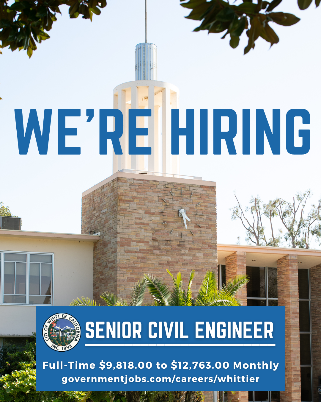 | | Celebrate Whittier's History at Founders Day! | | Join us for Founders Day at Central Park (6532 Friends Ave.) on Saturday, May 10, from 10:00 AM to 2:00 PM, as we celebrate community, history, and local businesses! This exciting event, hosted by the Whittier Historical Society & Museum, will feature a classic car show, live entertainment, family-friendly activities, and the beloved tradition of Quaker bread. Come connect with Whittierâs rich heritage, enjoy great food, and take part in a fun-filled day honoring the cityâs past and present. Donât miss outâscan the QR code on the flyer or visit whittiermuseum.org for more details! | | Join Our Team! Senior Civil Engineer Position Open Now | | The City of Whittier is seeking a highly skilled and motivated Senior Civil Engineer to join our team! This full-time position offers a competitive salary ranging from $9,818 to $12,763 per month and an exciting opportunity to contribute to important public works and infrastructure projects that shape our community. As a Senior Civil Engineer, youâll play a key role in designing, planning, and overseeing construction projects, ensuring the safety and efficiency of Whittierâs roads, utilities, and public facilities. If you have the expertise and passion for engineering, this is your chance to make a meaningful impact in a dynamic and welcoming city. Apply today at governmentjobs.com/careers/whittier and take the next step in your engineering career! | | | |