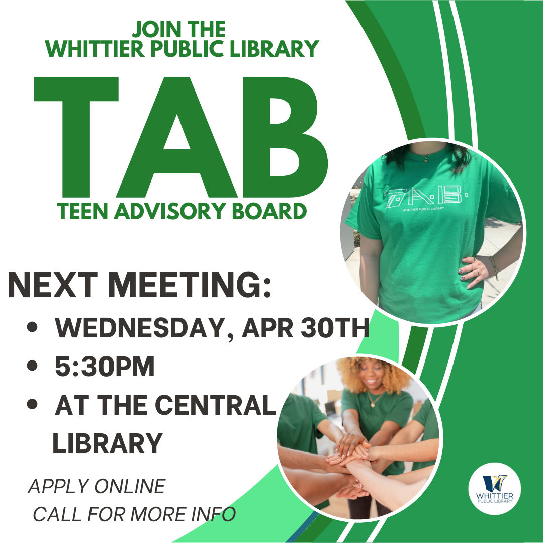 Calling all teens! The next Teen Advisory Board (TAB) meeting is happening on Wednesday, April 30 at 5:30 p.m. at the Central Library, located at 7344 Washington Ave., 90602. TAB is open to all high school students looking to get involved and make a difference at their library. First-time attendees must submit an application, available online or in person at the Central Library and Whittwood Branch Library.
