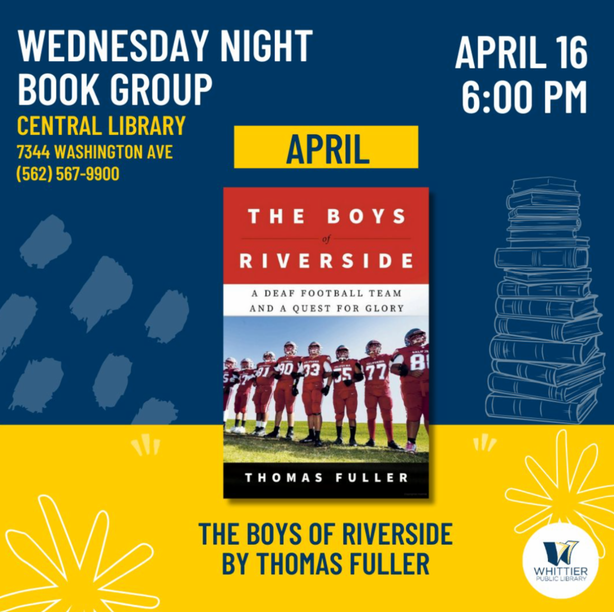 | | Wednesday Night Book Group - The Boys of Riverside | | Huddle up with us at the Central Library for our Wednesday Night Book Group as we discuss this yearâs Whittier Reads selection, The Boys of Riverside: A Deaf Football Team and a Quest for Glory.Join us on April 16th at 6:00 PM for a lively conversation with fellow readersâplease note, the author will not be present for this session but will be speaking the following week at Whittier Reads Author Talk event on April 24.. For more information, please call (562) 567-9900. | | Keep Whittier Prettier Event Popping Up on April 19 | | |