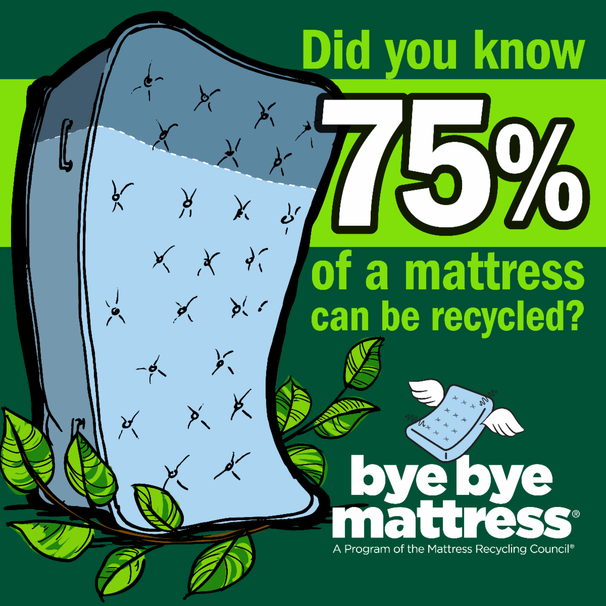 This Earth Day, take a simple step toward a greener planet by recycling your old mattress with the Mattress Recycling Councilâs Bye Bye Mattress program. This initiative works with Californiaâs existing waste infrastructure to divert mattresses from landfills, whether through retailer take-back programs, curbside pickup, or drop-off at a participating location.