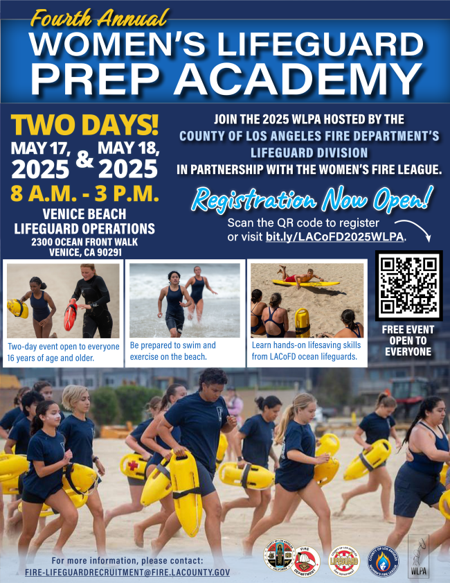 Get ready to dive into an exciting opportunity at the Fourth Annual Womenâs Lifeguard Prep Academy! Hosted by the Los Angeles County Fire Departmentâs Lifeguard Division in partnership with the Womenâs Fire League, this free, two-day event will take place on May 17 and May 18, 2025, from 8:00 AM to 3:00 PM at Venice Beach Lifeguard Operations (2300 Ocean Front Walk, Venice, CA 90291).