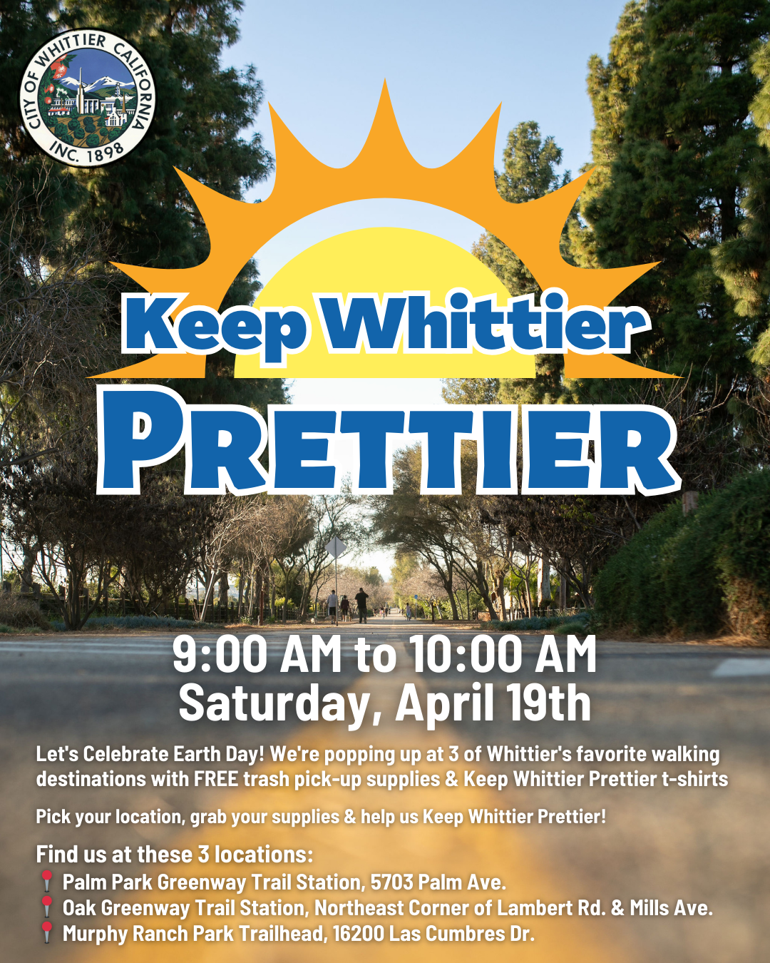 In honor of Earth Day, the City of Whittier is inviting residents to help Keep Whittier Prettier by joining a community cleanup pop-up on Saturday, April 19th from 9:00 a.m. to 10:00 a.m. at three of Whittierâs most popular walking destinations.
