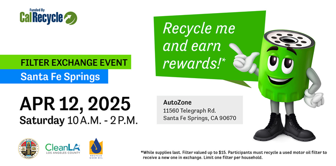 | | Go Green & Get Rewarded: Free Oil Filter Exchange Event | | Mark your calendars! The City of Santa Fe Springs is hosting a Filter Exchange Event on Saturday, April 12, 2025, from 10 A.M. to 2 P.M. at AutoZone (11560 Telegraph Rd., Santa Fe Springs, CA 90670). Funded by CalRecycle, this eco-friendly event allows participants to recycle their used motor oil filters and receive a free replacement filter valued up to $15 in return! Supplies are limited, and there is a one-filter-per-household limit, so be sure to arrive early. Help keep our environment clean by properly disposing of used oil filters and earning a reward in the process. | | Get Ready for Eggxtravaganza at Parnell Park April 12 | | |