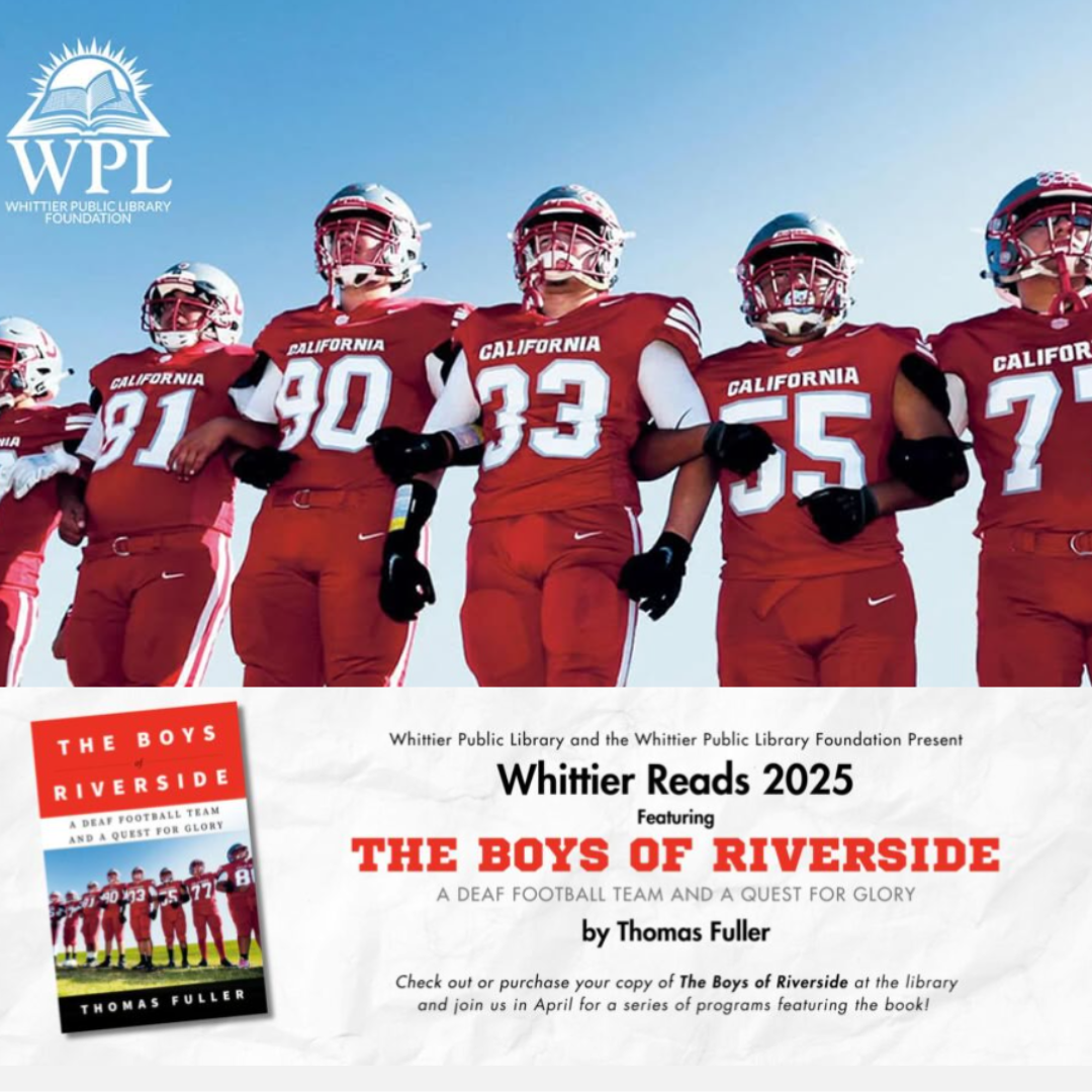 The Whittier Public Library is celebrating Whittier Reads in partnership with the Whittier Public Library Foundation, encouraging neighbors throughout our city to read together as a community. Join the Library this month for a variety of themed programs and events inspired by this yearâs book selection, "Boys of Riverside" by Thomas Fuller, including an Author Talk and ticketed reception at the end of the month.