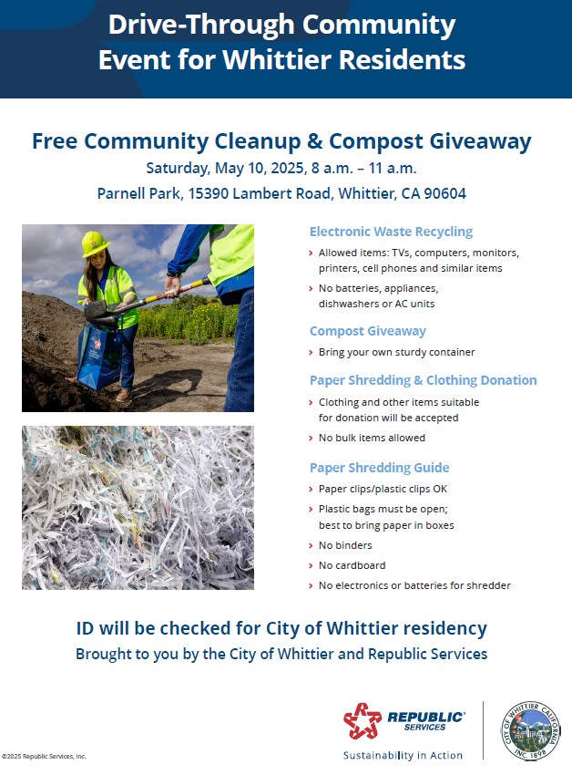 Mark your calendars! The City of Whittier, in partnership with Republic Services, will host a Community Cleanup and Compost Giveaway event on Saturday, May 10, 2025, from 8:00 a.m. to 11:00 a.m. at Parnell Park (15390 Lambert Road, Whittier, CA 90604).