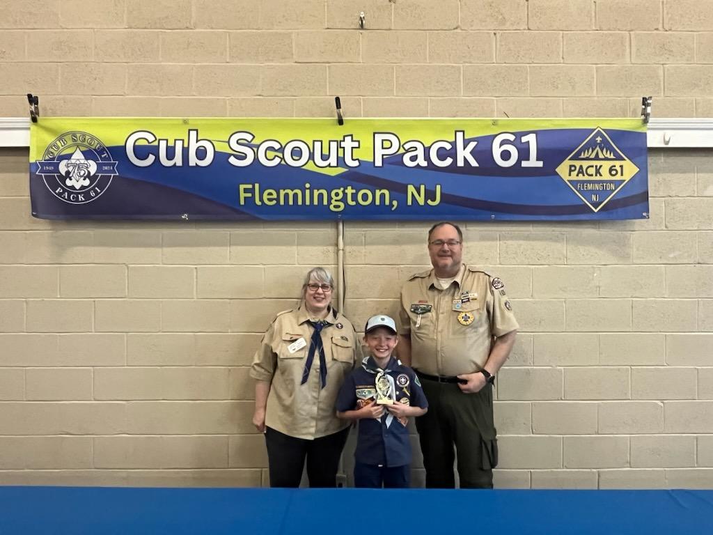 Janell Bunger-Spiecha, HAD District Commissioner and Chris Phelan, HAD District Chair presenting the First Place Trophy for Popcorn sales to Cub Scout, James G. of Pack 61 in Flemington. James sold $5,605 and Pack 61 came in 2nd overall in the Council selling over $41,475. Great Job James and Pack 61! | |