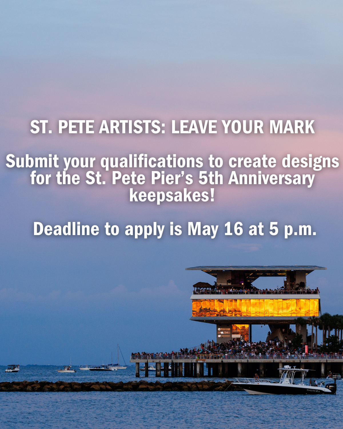 🔹 Step 2 - Three artists will be selected, and each will receive a $300 stipend and have one week (deadline is May 28) to create a design capturing the essence of the Pier and the vibrant St. Pete community. Criteria for choosing the three selected artists will be adequate proof of living or working in St. Pete, FL, artist’s resume/cv and quality of work samples.