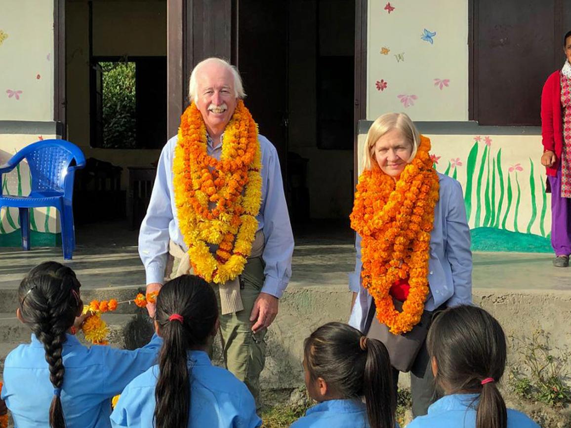 Founders Giuseppe and Jackie Carnevali at the inauguration ceremony of the Tharevir Primary School in 2019.