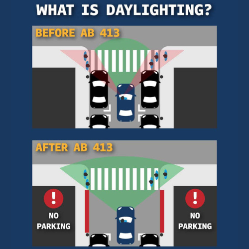 Daylighting ensures a clear approach zone near crosswalks, allowing drivers to better see pedestrians and other road users entering the roadway. With nearly half of traffic-related injuries occurring near intersections and California's pedestrian fatality rate 25% above the national average, AB 413 is a critical measure to reduce injuries and save lives.