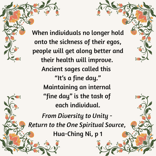 Lately, I have heard from a number of people in distress over the rapid and disorienting changes since the election. In a time of political upheaval, division and uncertainty, it is natural to feel challenged in maintaining our inner peace while engaging with the world around us. I would like to offer this as an opportunity for us to cultivate and apply the spiritual principles of the Tao to our community. The teachings of the Integral Way offer us a path forward--one that allows us to remain spiritually grounded while adapting to the shifting climate of politics and societal change.