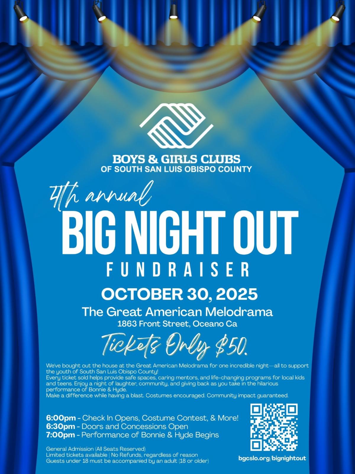 Join us for the hilarious Bonnie & Hyde, a lively costume contest, and refreshments—all while helping provide safe spaces and programs through the Boys & Girls Clubs.