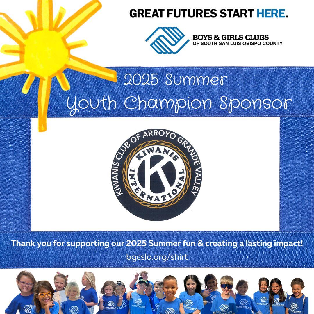 A big thank you to our Week 9 Sponsor, Kiwanis Club of Arroyo Grande Valley, for your generous support of our Summer Camps. Your ongoing dedication helps us create enriching and memorable experiences for the youth in our community!