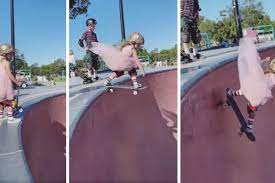 Paige Tobin, a 6-year-old Australian girl, drops into a 12-foot bowl on her skateboard while wearing a princess dress, rainbow socks, crash pads, and a leopard print helmet. #girlswhocanskate