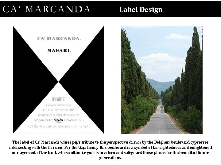 The design of the Ca'Marcanda label is a representation of the famous Bolgheri Boulevard, lined by cypress trees on the left and right intersecting the horizon. It is a had-to-be-there concept, but it really hits home after visiting Bolgerhi as I did years ago driving down that road on our way to Sassicaia and Ornelaia.