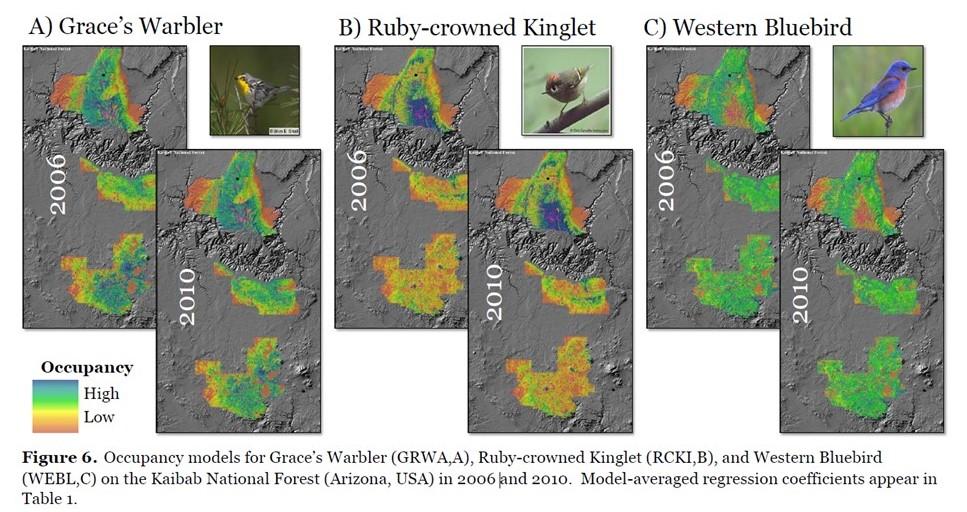 Forest managers expect restoration targeting vegetation structure to benefit ecological function, much of which concerns providing habitat for wildlife. Therefore, wildlife are often the focus of effectiveness monitoring. The Four-Forest Restoration Initiative leveraged 10 years of IMBCR monitoring data in the Coconino & Kaibab National Forests to inform predictions of potential treatment effects. Quresh applied Bayesian hierarchical models to estimate relationships of species occupancy, richness, abundance, and turnover with vegetation attributes relevant to forest restoration. Estimated habitat relationships with occupancy and abundance were consistent with most treatment effects hypotheses for 60 species, which can be used to inform management decisions. Read the full report here.