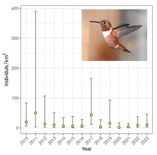 Above: Evening Grosbeak density estimates and 95% credible interval bars in the roaded/managed portion of the Kootenai National Forest in Montana. Left: Rufous Hummingbird density estimates and 95% credible interval bars in the same stratum.