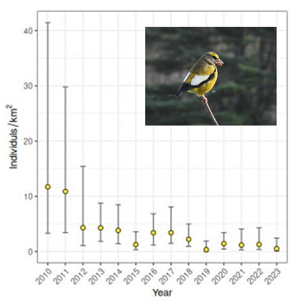 Two species that Ron is tracking on the Kootenai National Forest are the Evening Grosbeak and the Rufous Hummingbird, both Road to Recovery Tipping Point species. The Evening Grosbeak population is decreasing 18.6%/year in the roaded/managed portion of the Kootenai NF in Montana, while the Rufous Hummingbird population is decreasing about 10%/year.