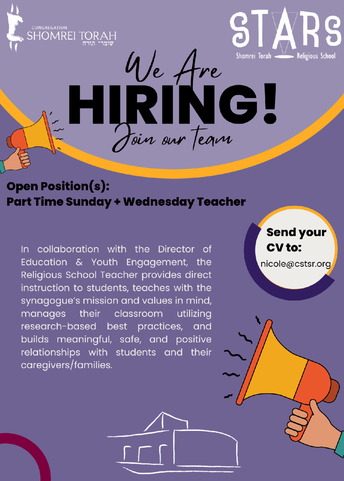 Shomrei Torah's Religious School is hiring. In collaboration with the Director of Education & Youth Engagement, the Religious School Teacher provides direct instruction to students, teaches with the synagogue's mission and vision in mind, manages their classroom and builds meaningful, safe, and positive relationships with students and their families/caregivers.